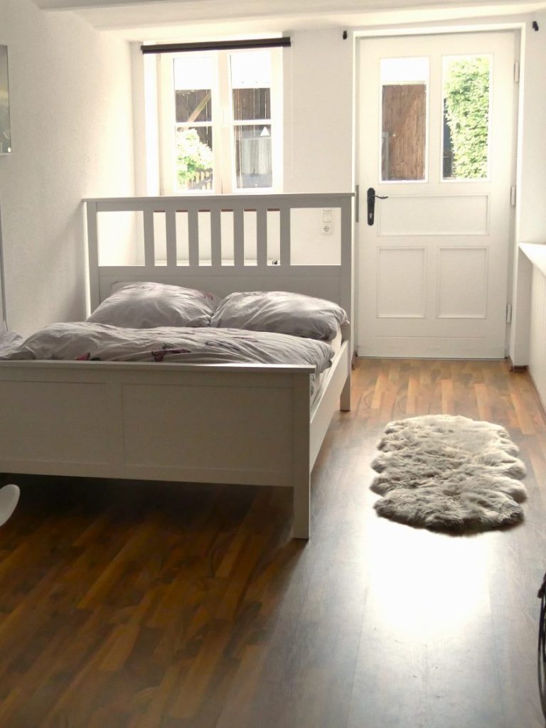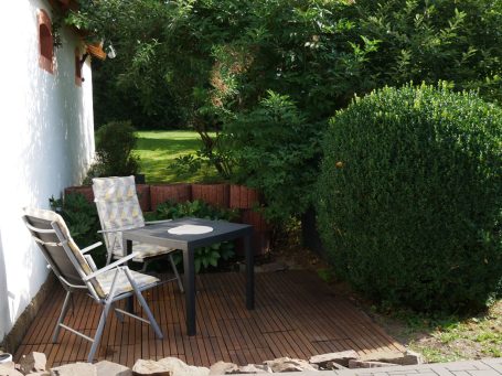 Unsere Ferienwohnung bietet Platz für zwei Personen mit Hund. Eine kleine Küche, ein Bad mit Dusche sowie ein Schlaf- und Essbereich und eine kleine Terasse mit Blick in den Garten laden zur Erholung ein.